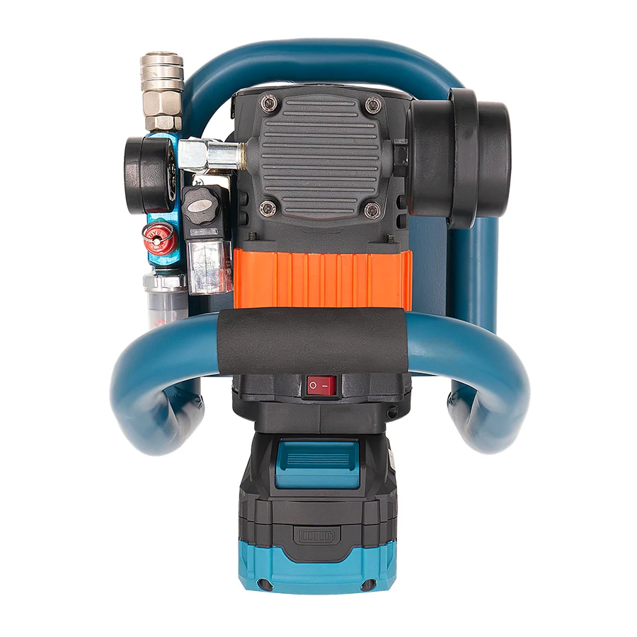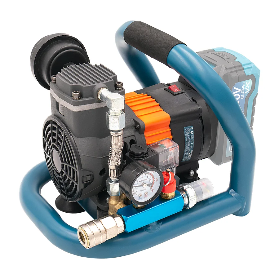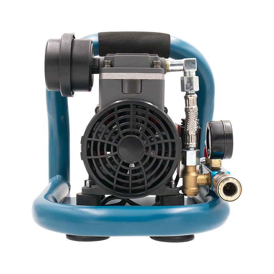 - Портативна конструкція з ручкою полегшує переміщення компресора і підвищує зручність транспортування під час роботи.